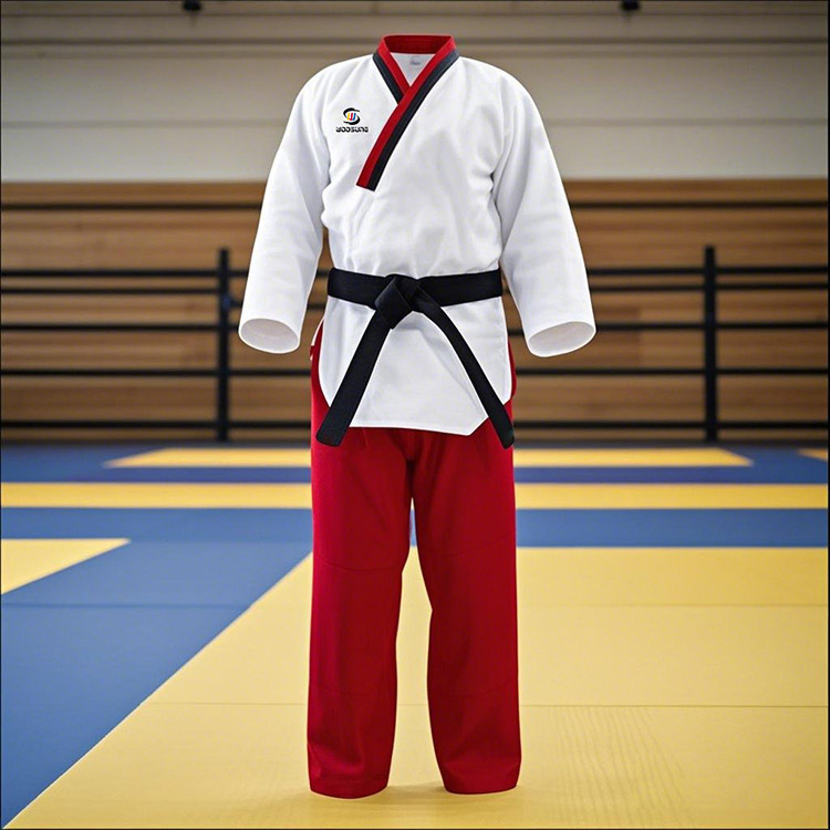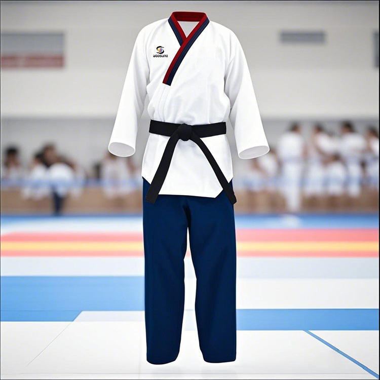 このテコンドー プムセ ユニフォームは、プレミアム ポリエステルと綿の混紡生地を使用しており、卓越した快適性と通気性を実現し、オールラウンドに着用しやすくなっています。繊細な刺繍ロゴやトリミングが施されたエレガントなデザインが、装いに洗練されたタッチを加えます。 The pants are crafted for optimal flexibility and come with a practical drawstring waistband for a customizable and secure fit.
