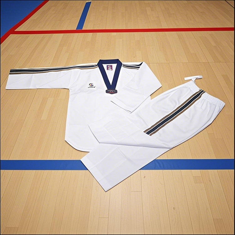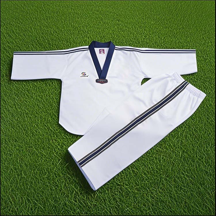 このストライプのテコンドーユニフォームは、黒の V ネックの襟と袖とパンツの脚に特徴的な赤、白、青のストライプのアクセントを備えた鮮明な白のデザインが特徴です。安全なドローストリングウエストと強化ステッチにより耐久性と制限のない動きを確保し、胸のエンブレムが本格的なタッチを加えています。ブルーのランクベルトと組み合わせることで、日々のトレーニングや競技イベントの両方に最適です。