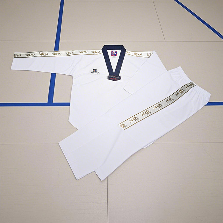 デザイン面では、テコンドー道着のストライプ柄が独特の縞模様を際立たせている。これらのストライプは流れるようなメロディーのようなもので、ユニフォームに視覚的なレイヤードとダイナミクスを加えます。ジャケット部分は精密な強化縫製技術と体にフィットした仕立てを採用し、ウェアの耐久性を維持しながらトレーニング中のスムーズかつ自由な動きをサポートします。絶妙な刺繍バッジとエッジ処理。